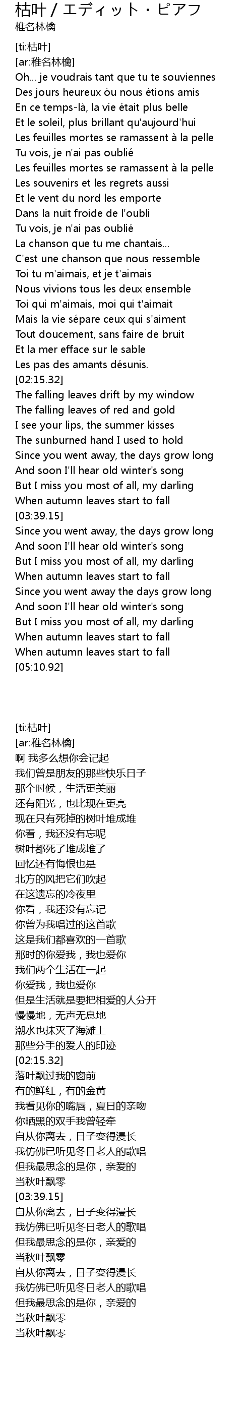 | [00:36.40] | Les feuilles mortes se ramassent a la pelle |