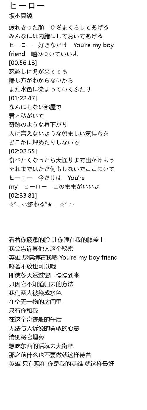 | [02:18.33] | ヒーロー 今だけは You're my ヒーロー このままがいいよ |