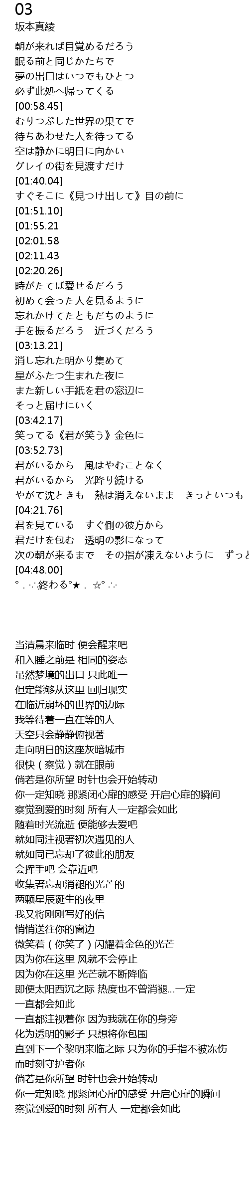 | [04:35.38] | 次の朝が来るまで その指が凍えないように ずっと |