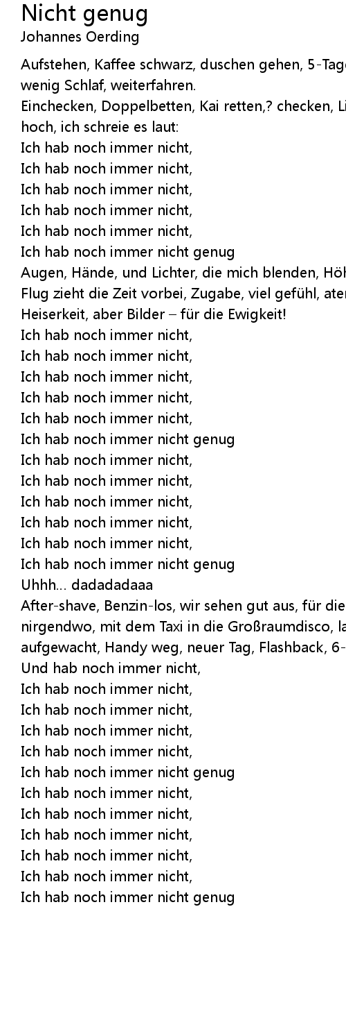 | After-shave, Benzin-los, wir sehen gut aus, für die After-Show, und irgendwo im nirgendwo, mit dem Taxi in die Großraumdisco, lange Nacht, spät ins Bett, aufgewacht, Handy weg, neuer Tag, Flashback, 6-Tage-Bart, ich liebe es | |