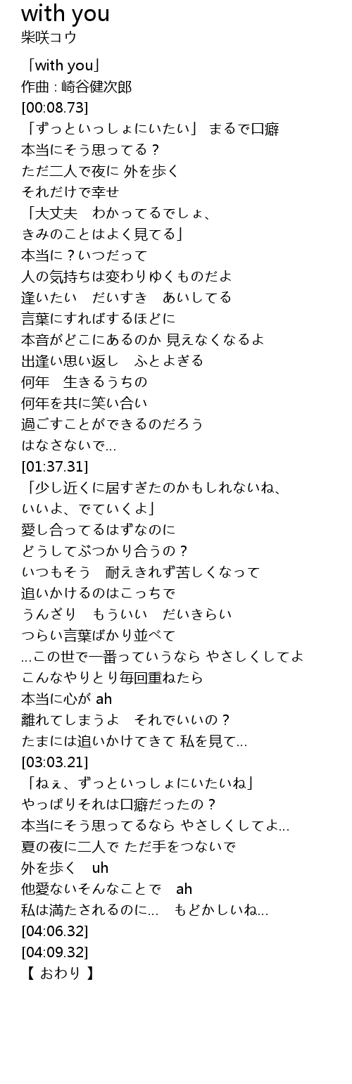 | [00:10.73] | 「ずっといっしょにいたい」 まるで口癖 |