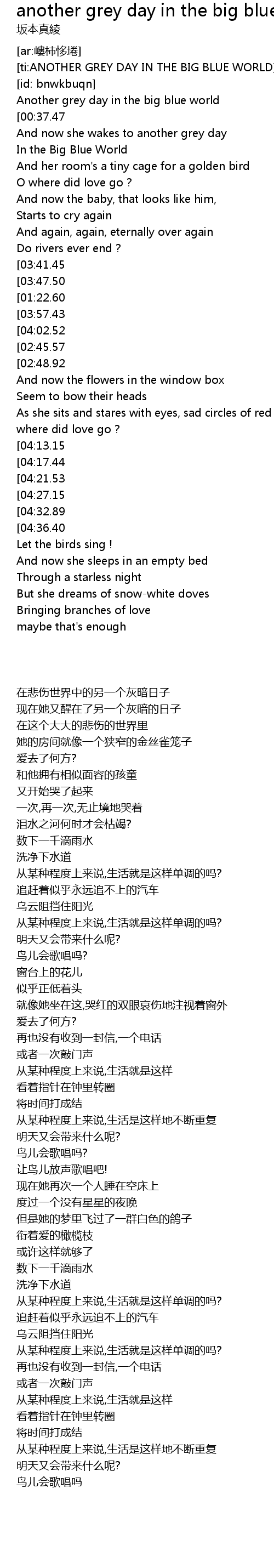 | [01:32.39][02:48.92][04:46.26] | Will birds sing ? |