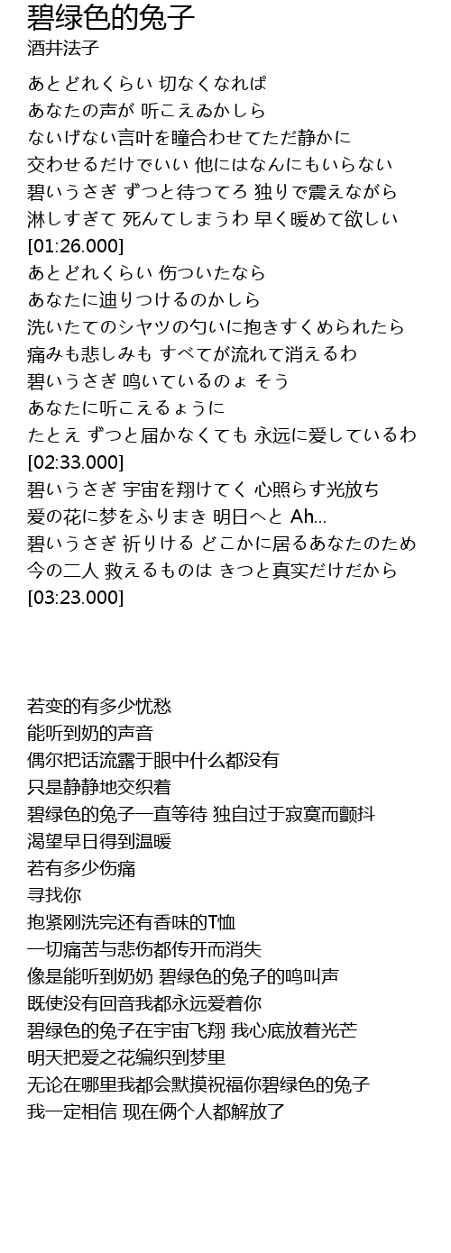 | [03:03.000] | 碧いうさぎ 祈りける どこかに居るあなたのため |