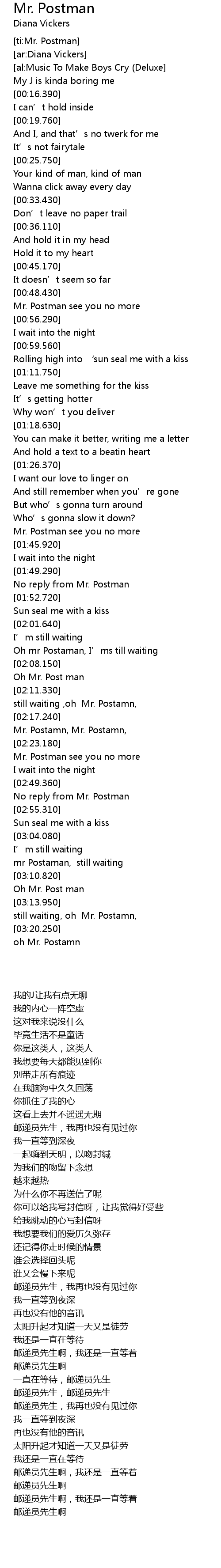 | [02:03.720] | Oh mr Postaman, I' ms till waiting |