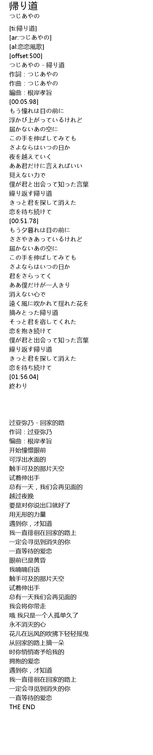 | [00:00.00] | つじあやの - 帰り道 |
