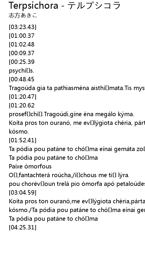 | [04:08.37] | Koi ta pros ton ourano, me ev l giota che ria, pa rta o la oton ko smo. Ta po dia pou pata ne to cho ma ei nai gema ta zoi. |