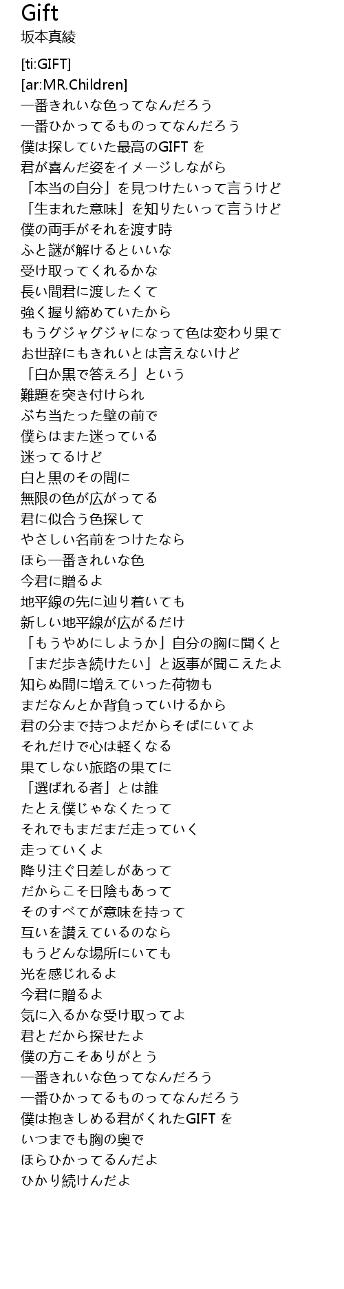 | [05:12.376] | 僕は抱きしめる君がくれたGIFT を |