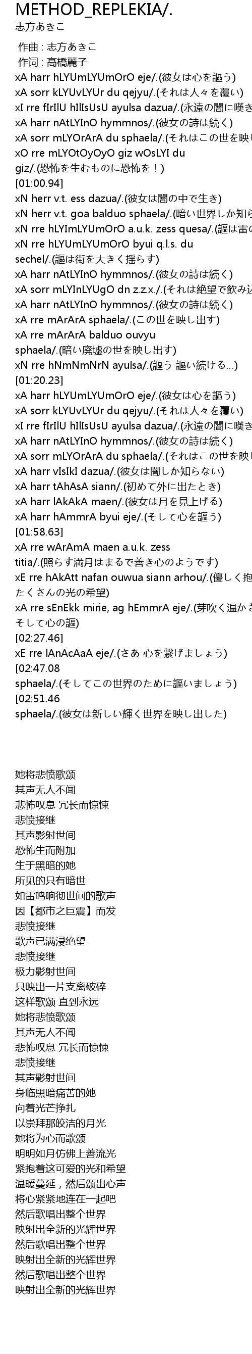 | [02:55.57][02:47.08][02:32.00] | xA rre hLYAmLYEmLYErA sphaela/.(そしてこの世界のために謳いましょう) |