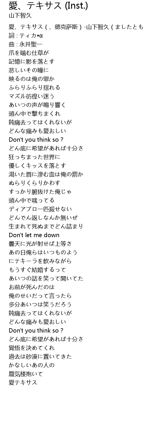| [00:00.00] | 愛、テキサス(、德克萨斯)-山下智久(ましたともひさ) |