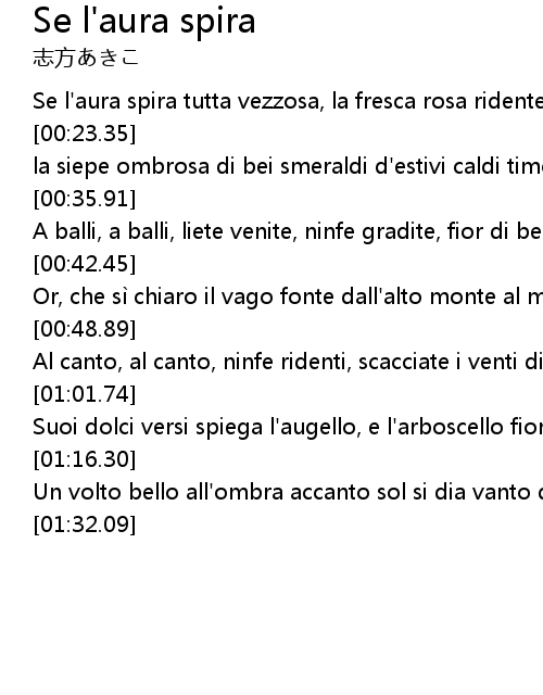 | [00:10.20] | Se l'aura spira tutta vezzosa, la fresca rosa ridente sta, |