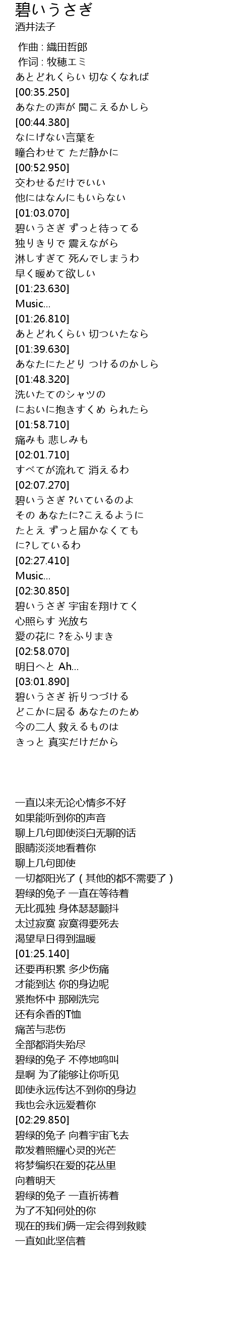 | [03:03.880] | 碧いうさぎ 祈りつづける |