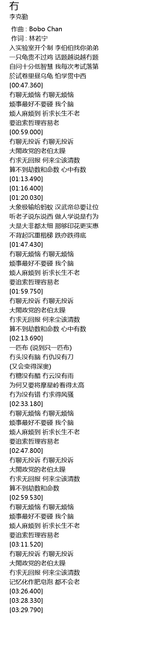 | [00:47.370] | 冇聊无烦恼 冇聊无烦恼 |