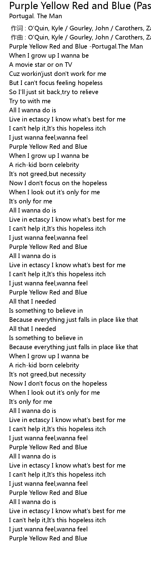 | [00:00.560] | Purple Yellow Red and Blue -Portugal.The Man |