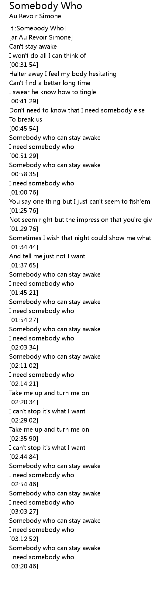 [03:05.65] Somebody who can stay awake