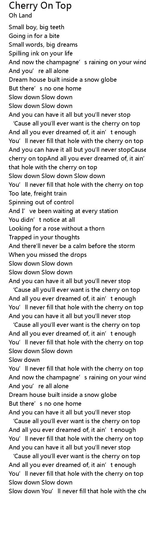 | And you can have it all but you'll never stopCause all you'll ever want is the cherry on topAnd all you ever dreamed of, it ain’t enoughYou’ll never fill that hole with the cherry on top | |