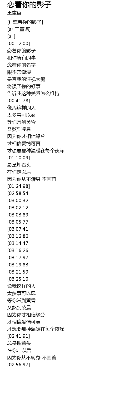 | [03:30.39][03:02.12][01:30.38] | nǐ hái shì zǒu hái bù huí tóu |