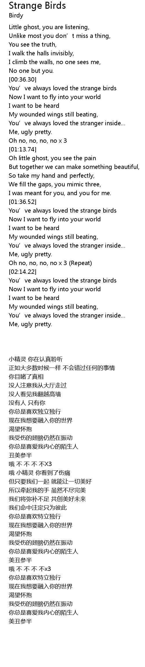 | [00:36.54] | You’ve always loved the strange birds |