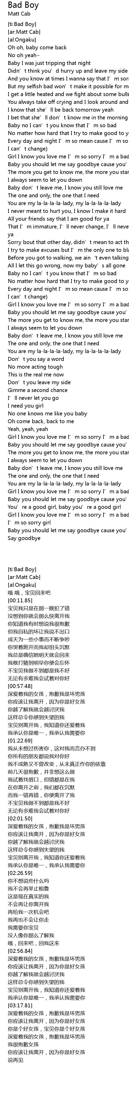 | [02:08.38] | Girl I know you love me I' m so sorry I' m a bad boy |