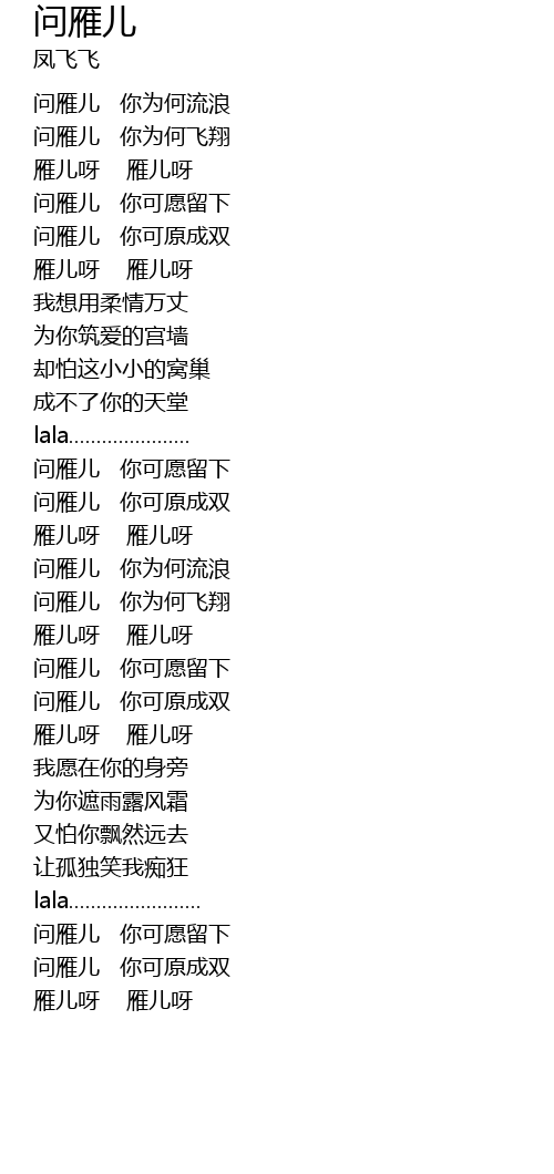| [00:19.64] | wèn yàn ér nǐ wèi hé fēi xiáng |