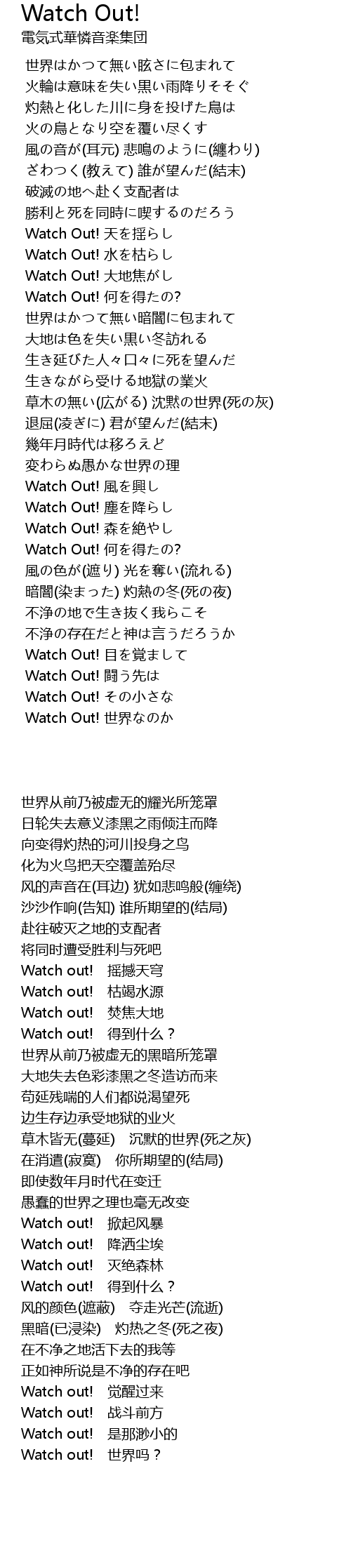 | [03:20.500] | Watch Out! shì jiè |