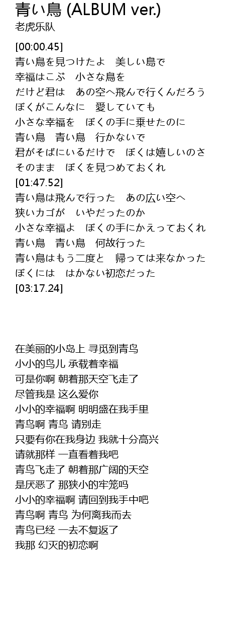 | [00:17.53] | 青い鳥を見つけたよ 美しい島で |