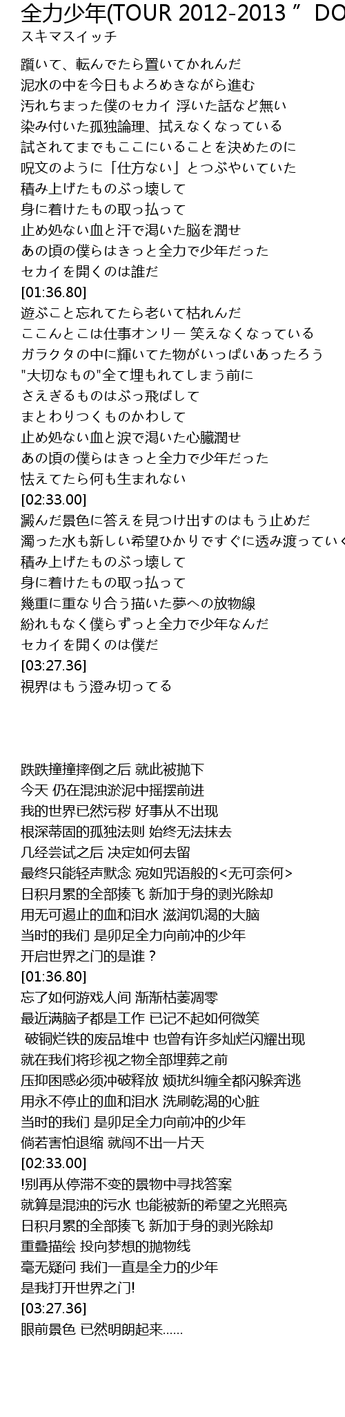 | [03:14.90] | 紛れもなく僕らずっと全力で少年なんだ |