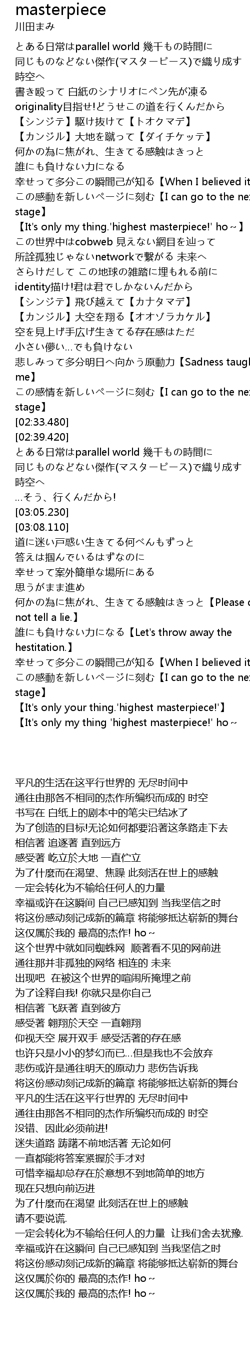 | [02:52.960] | 同じものなどない傑作(マスターピース)で織り成す 時空へ |