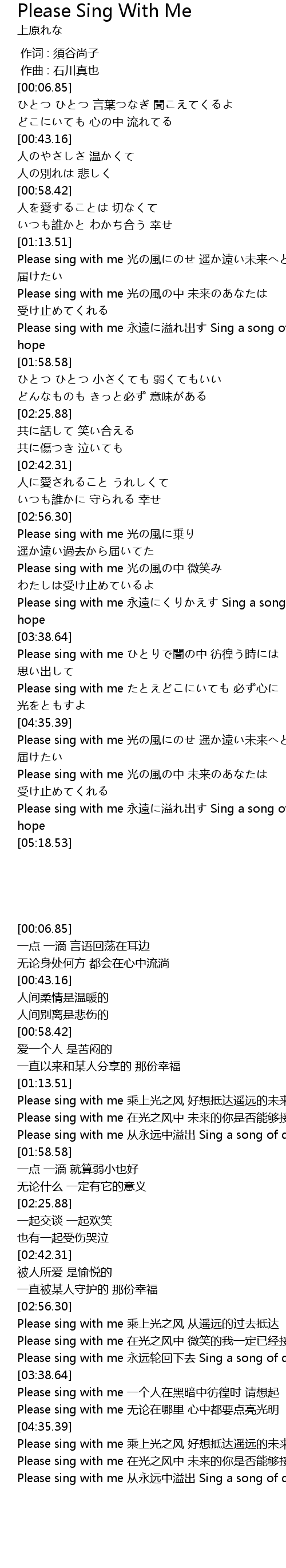 | [03:23.80] | Please sing with me 永遠にくりかえす Sing a song of dream and hope |