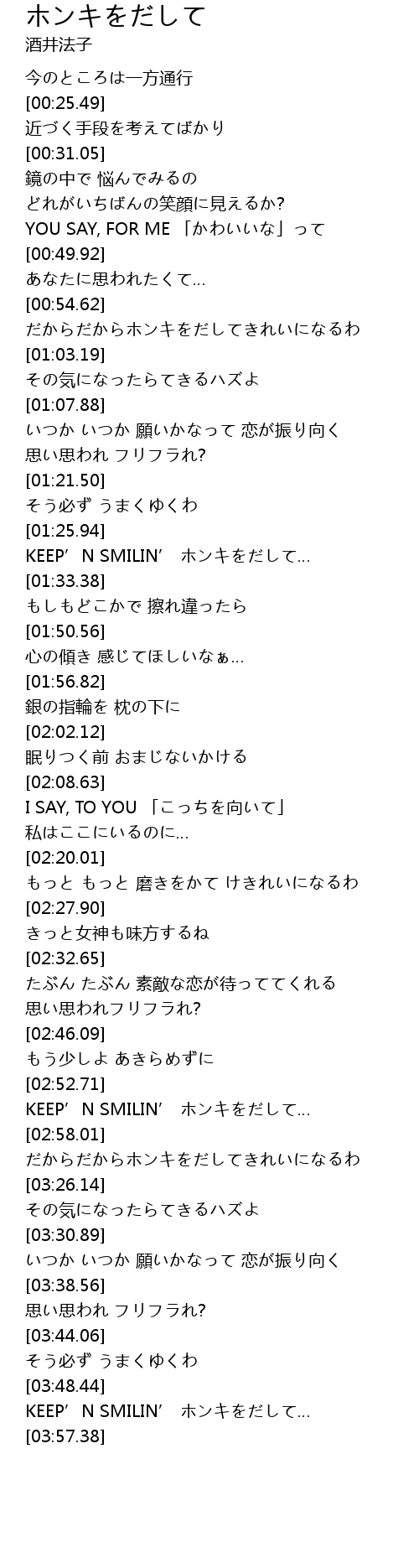 | [03:51.75] | KEEP’N SMILIN’ ホンキをだして… |