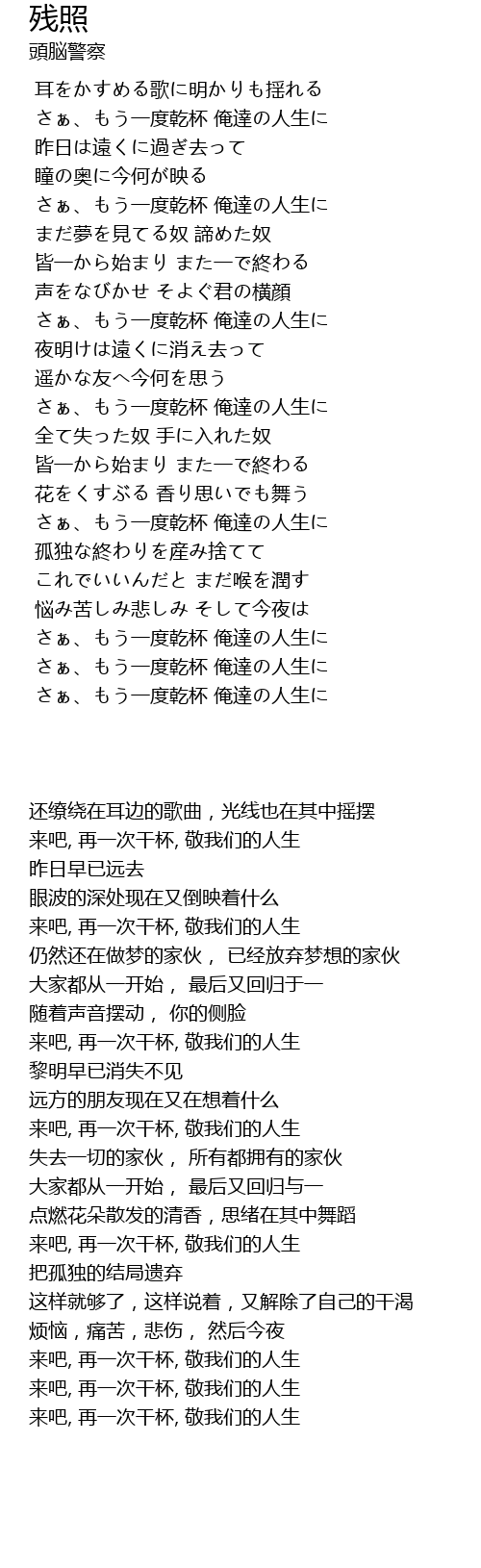 | [02:57.00] | さぁ、もう一度乾杯 俺達の人生に |