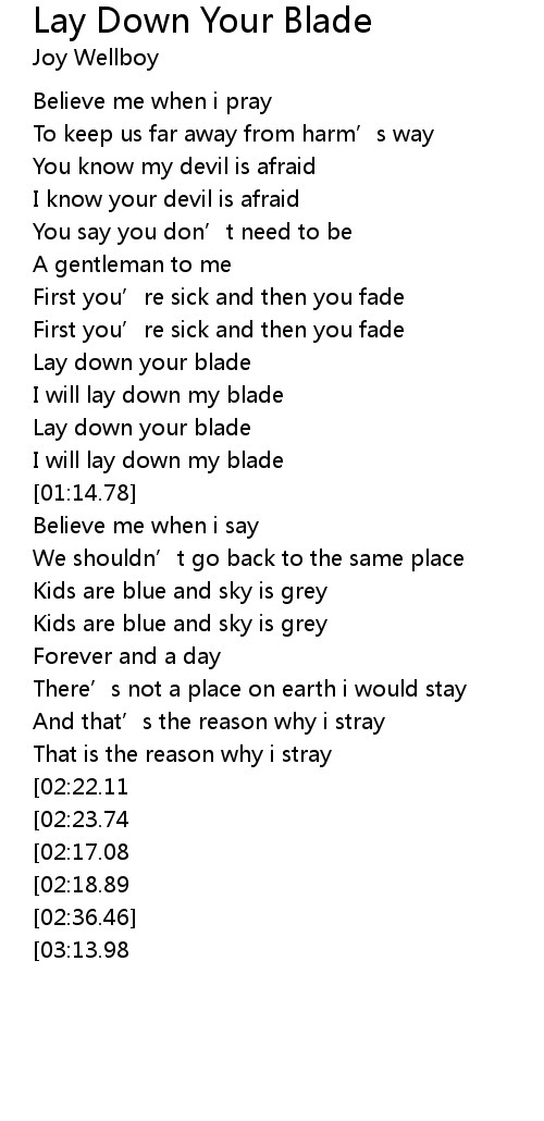 | [02:31.51][02:22.11][02:12.34][01:58.15] | Lay down your blade |
