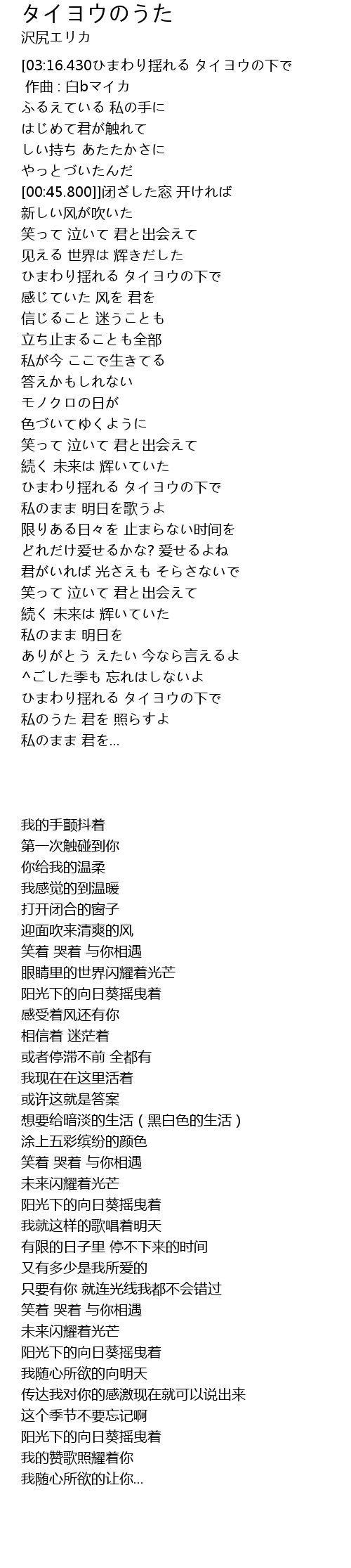 | [02:16.300] | ひまわり揺れる タイヨウの下で |