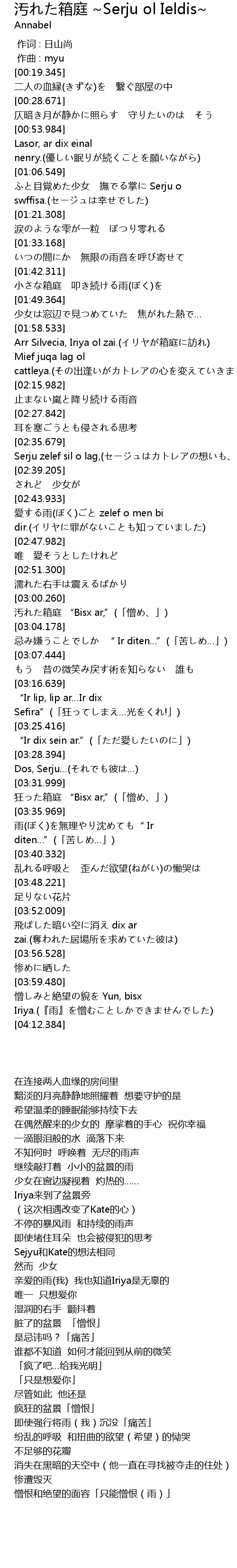 | [03:59.480] | 憎しみと絶望の貌を Yun, bisx Iriya.(『雨』を憎むことしかできませんでした) |
