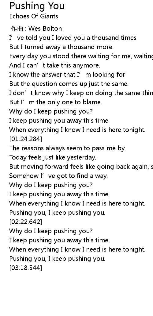| [03:08.669] | Pushing you, I keep pushing you. |