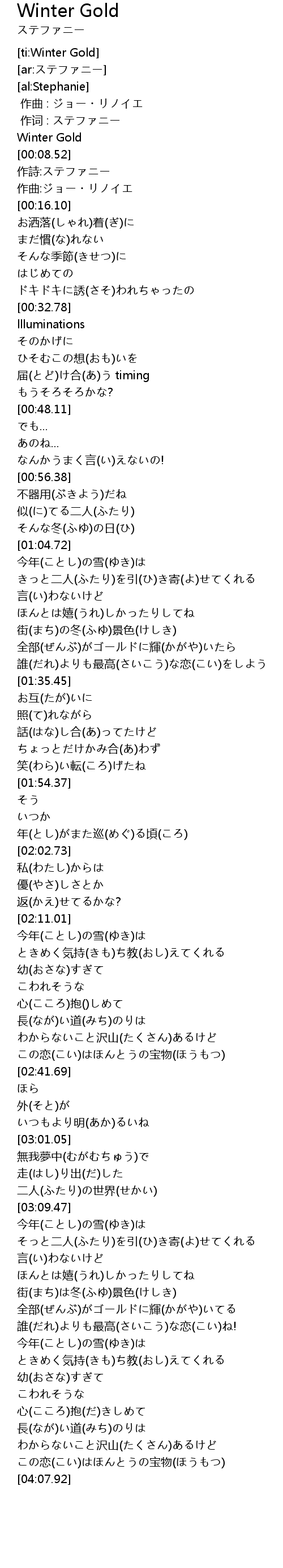 | [03:28.26] | 全部(ぜんぶ)がゴールドに輝(かがや)いてる |