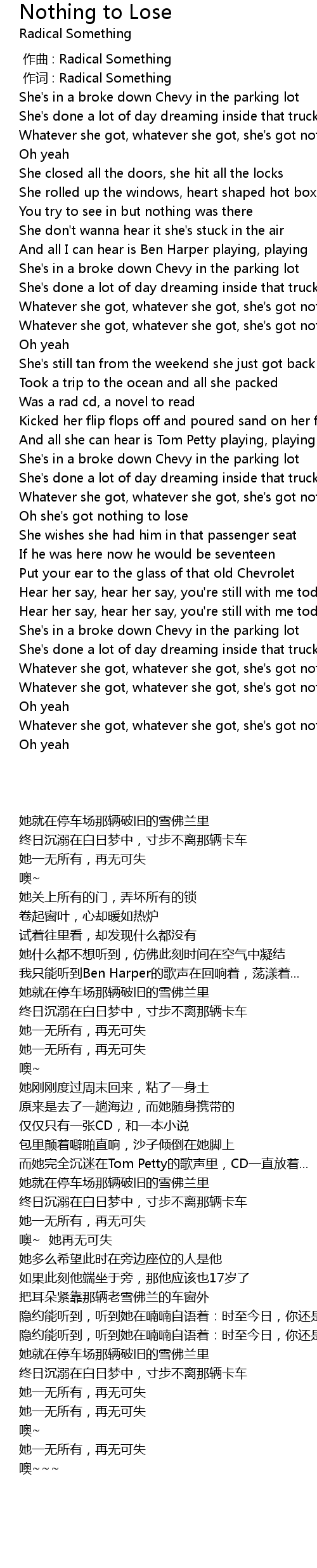 | [00:10.29] | Whatever she got, whatever she got, she' s got nothing to lose |
