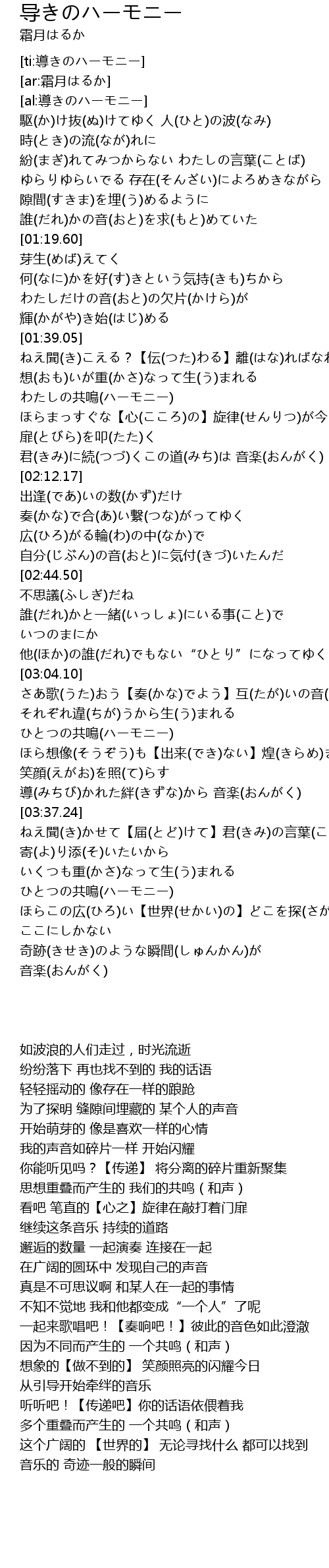 | [03:14.05] | それぞれ違(ちが)うから生(う)まれる ひとつの共鳴(ハーモニー) |