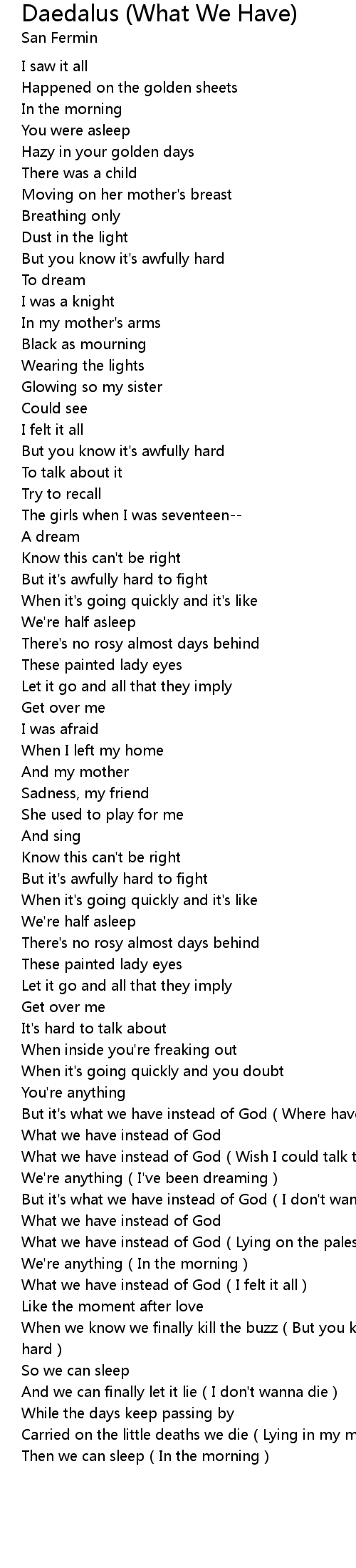 | [04:53.22] | What we have instead of God Lying on the palest sheets |