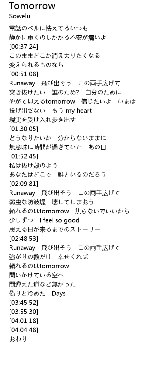 | [01:09.55] | やがて見えるtomorrow 信じたいよ いまは |