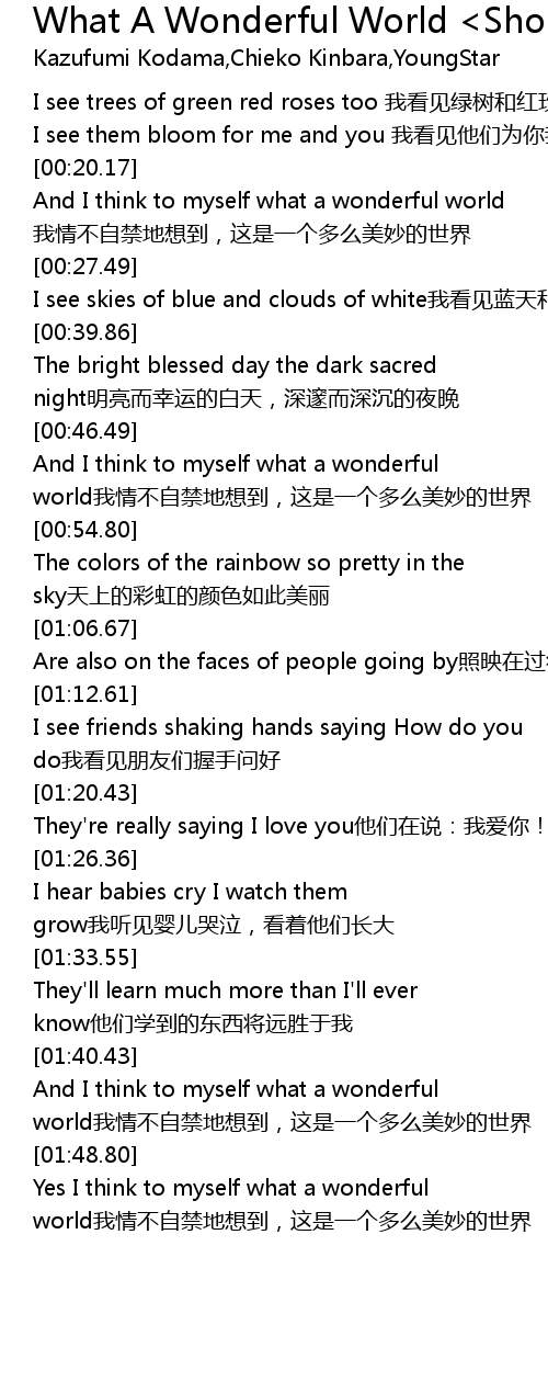 | [01:53.31] | Yes I think to myself what a wonderful world wo qing bu zi jin di xiang dao, zhe shi yi ge duo me mei miao de shi jie |