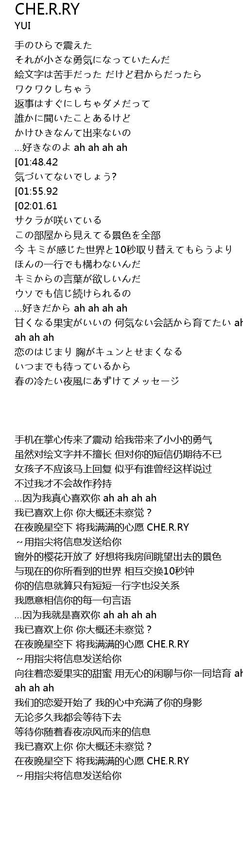 | [02:50.89][01:55.92][00:54.41] | 星の夜 願い込めて CHE.R.RY |