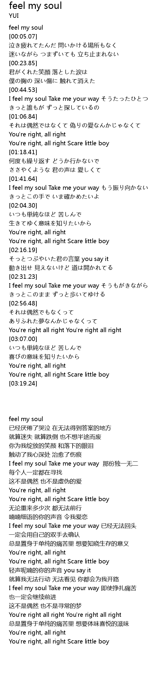 | [00:45.86] | I feel my soul Take me your way そうたったひとつを |