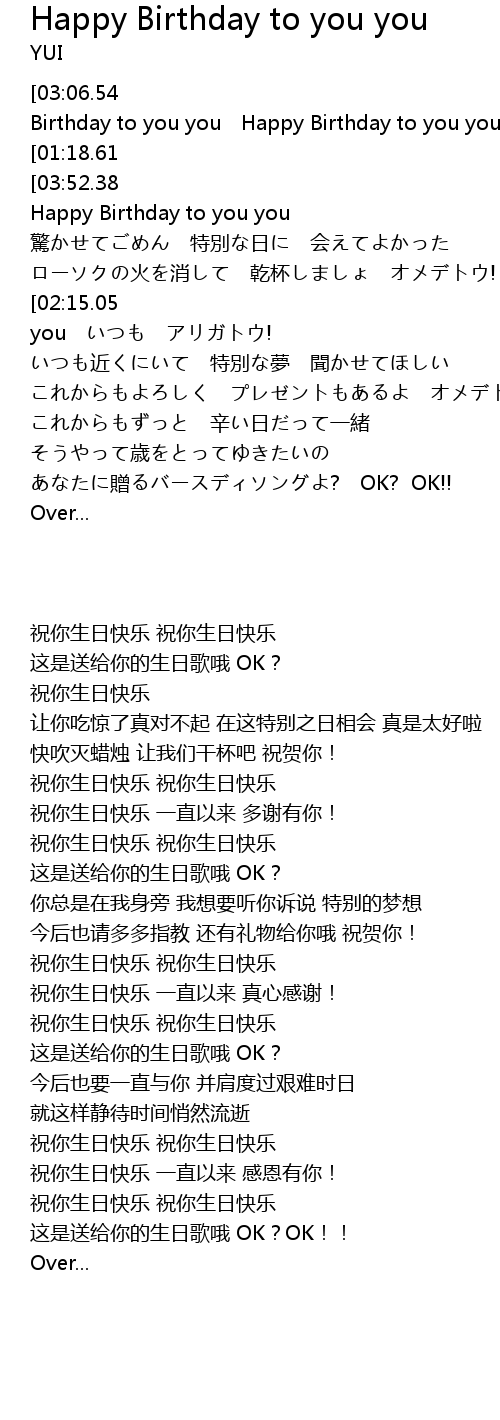 | [03:20.10][03:06.54][02:21.94][02:08.31][01:11.76][00:58.11][00:02.01] | Happy Birthday to you you Happy Birthday to you you |