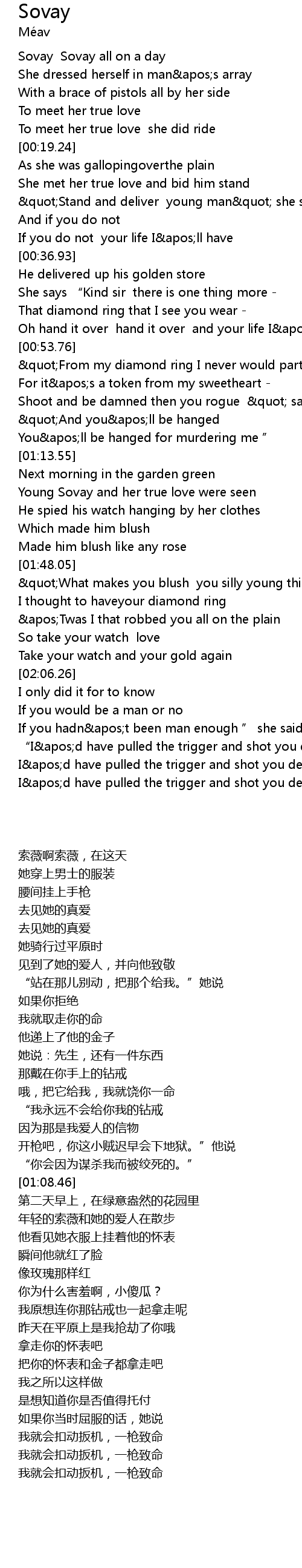 | [01:36.36] | Young Sovay and her true love were seen |