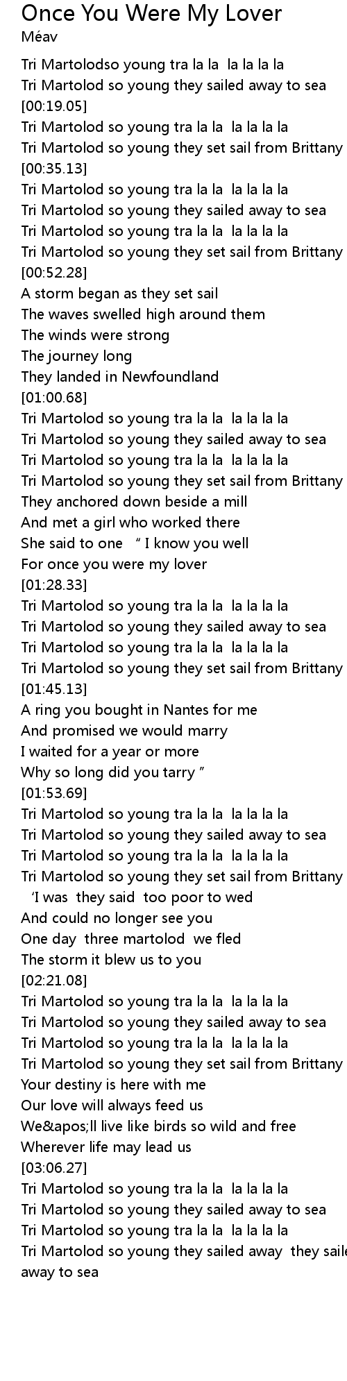 | [03:19.71] | Tri Martolod so young they sailed away they sailed away they sailed away to sea |