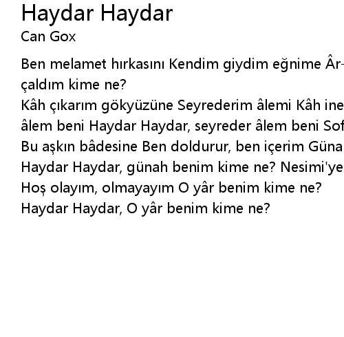 | Kâh çıkarım gökyüzüne Seyrederim âlemi Kâh inerim yeryüzüne Seyreder âlem beni Haydar Haydar, seyreder âlem beni Sofular haram demişler | |