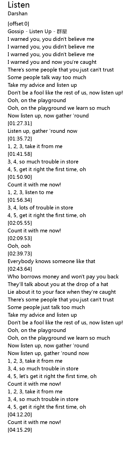 | [00:00.83] | Gossip - Listen Up - 群星 |