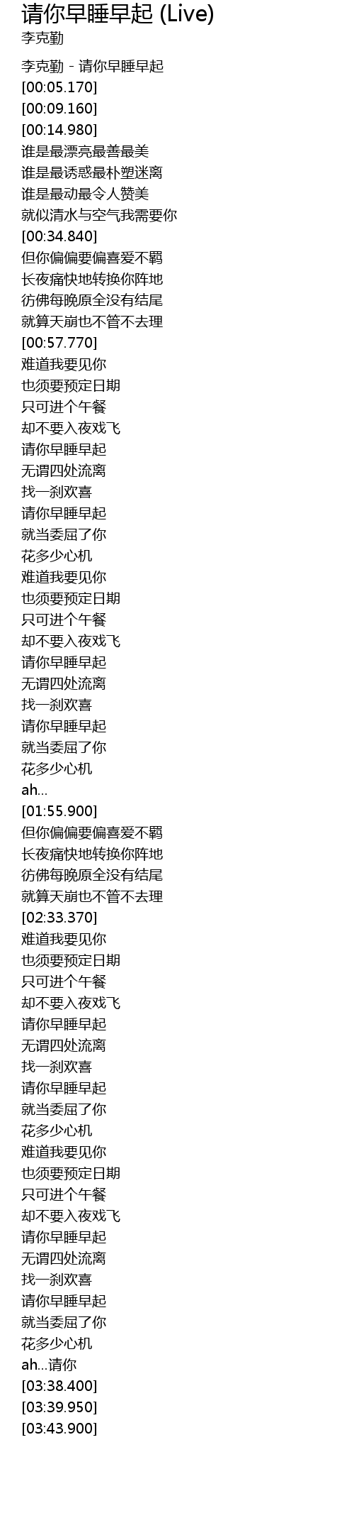 | [00:00.370] | 李克勤 - 请你早睡早起 |