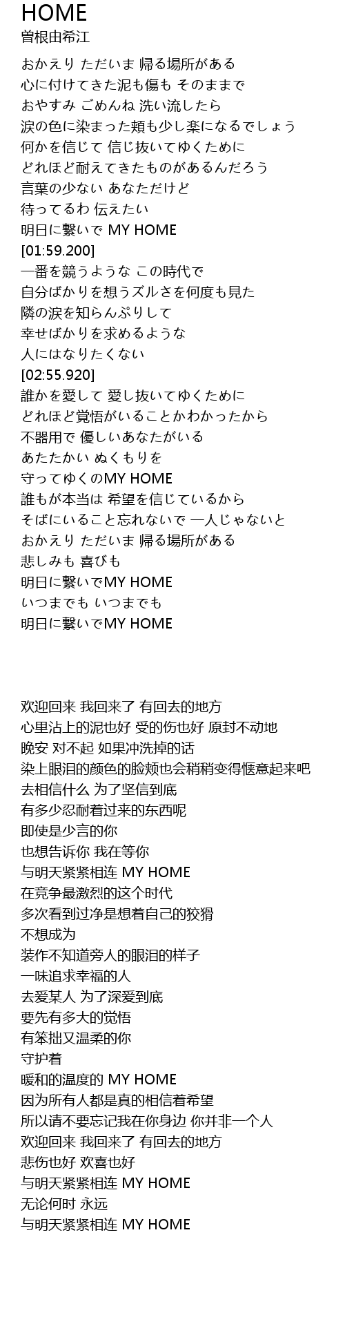 | [01:54.020] | 明日に繋いで MY HOME |