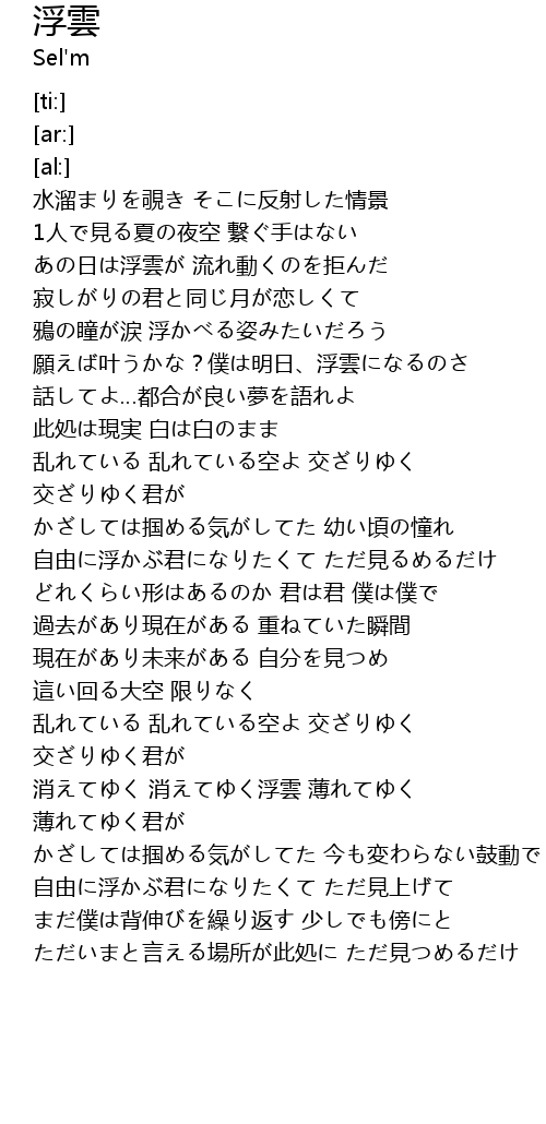 | [00:55.87] | 願えば叶うかな?僕は明日、浮雲になるのさ |